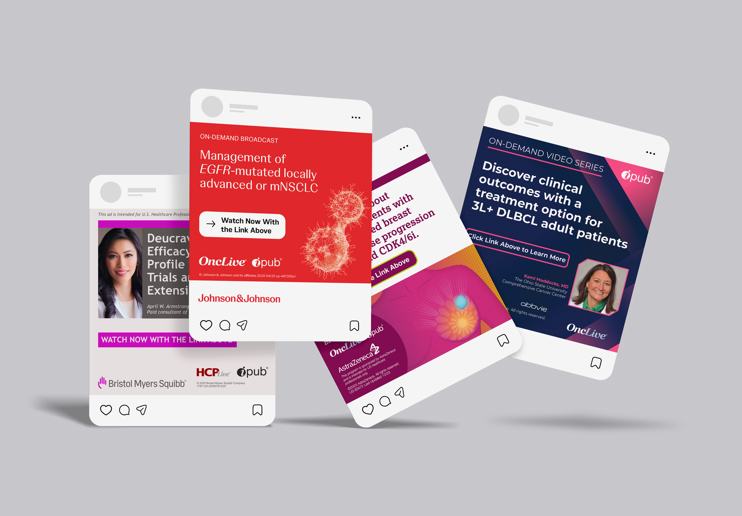 Creative direction and execution of omnichannel campaigns for top pharmaceutical clients. Work includes adapting and extending existing brand systems into digital and print deliverables — emails, microsites, social ads, and banners — produced in collaboration with cross-functional teams under strict compliance and regulatory standards.